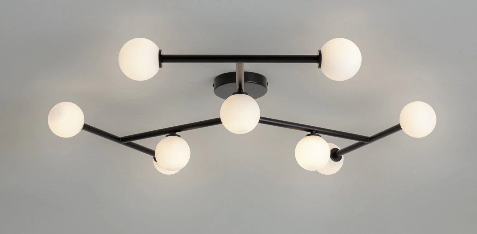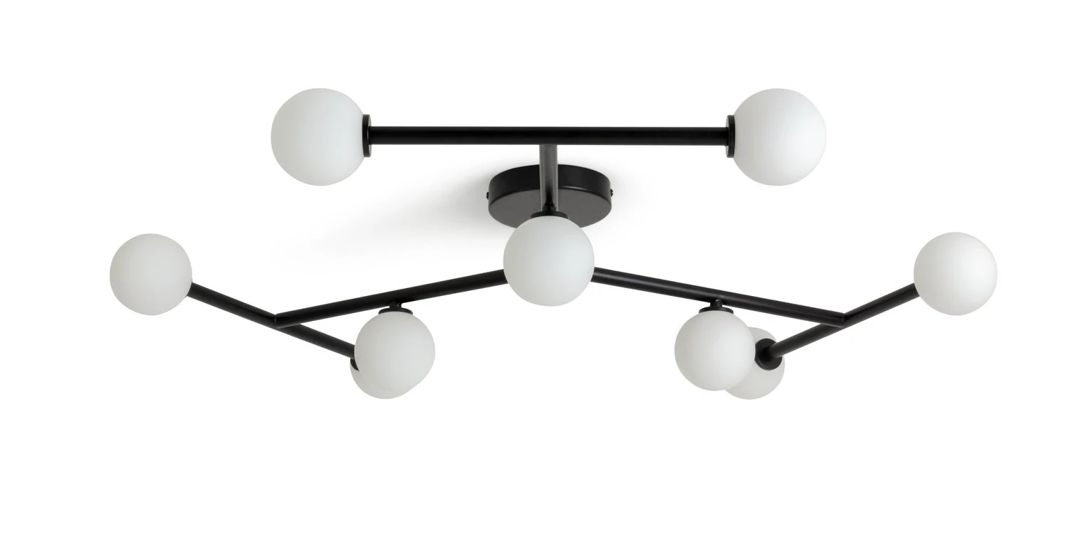 Meet Alonso, the modern chandelier. A stunning combination of 9 organic glass globes and black sprayed steel, this ceiling light will add instant mid-century chic to your look. It's ideal for lower room hights, with its flush to ceiling gallery and shorter drop. Want to dial it down? Add a dimmer switch and this fabulous array of glowing glass will gives off several levels of calm, diffuse light. Lovely. Match with natural wood furniture and graphic patterns and really embrace your inner Scandi.