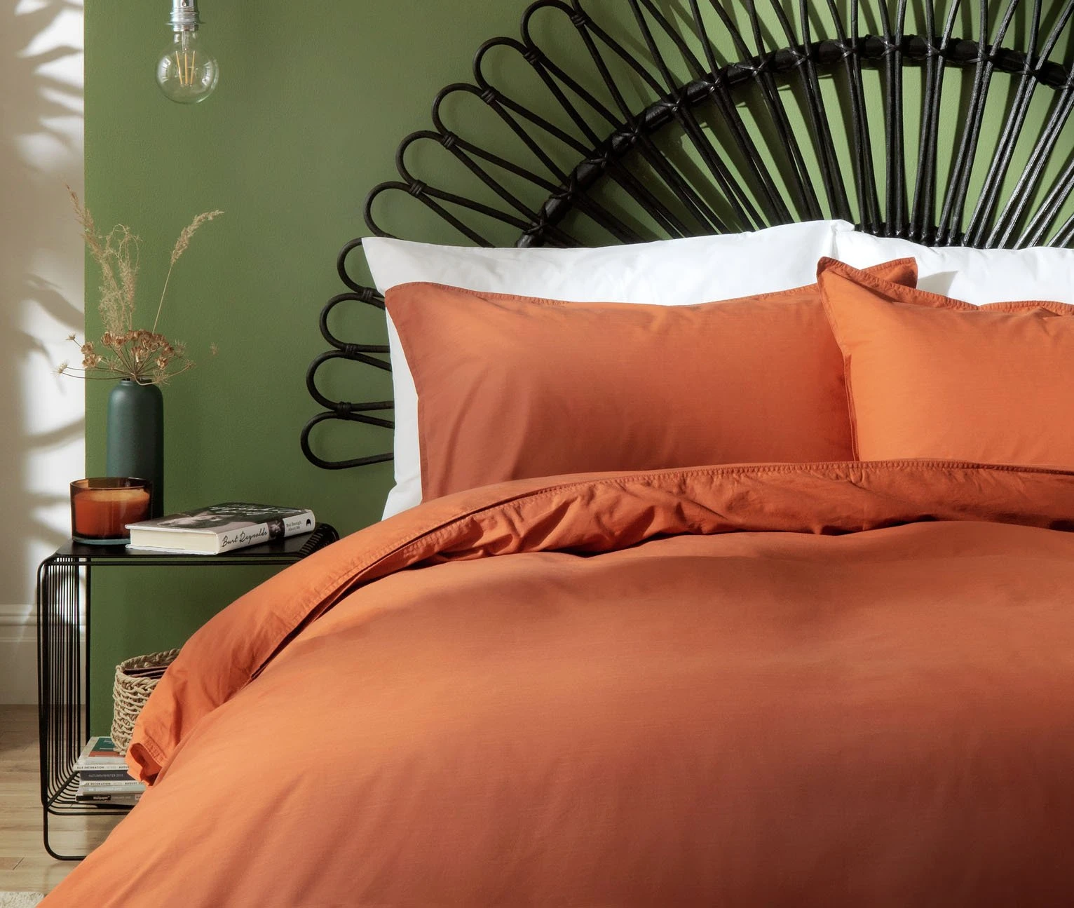 Warm and earthy. This burnt orange duvet set in 100% cotton linen-look is soft and sumptuous. Finished with fine stitching detail and featuring easy button fastening, the rich, earthy tones will tempt you to cosy up for a little longer. Team with textured throws and moody lighting and get ready to chill.