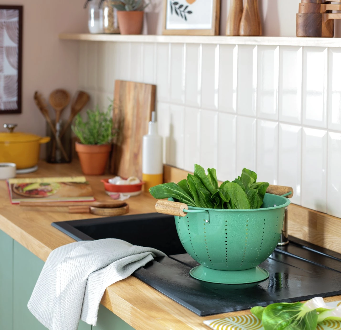 Retro classic. Accessorise your kitchen with this fashionable and functional green colander. Lightweight and easy to use it makes draining, straining and rinsing a doddle. With a robust enamel coating, mango wood easy grip handles and a practical raised base, it offers bags of style. A standout strainer for your counter. Definitely an everyday essential.