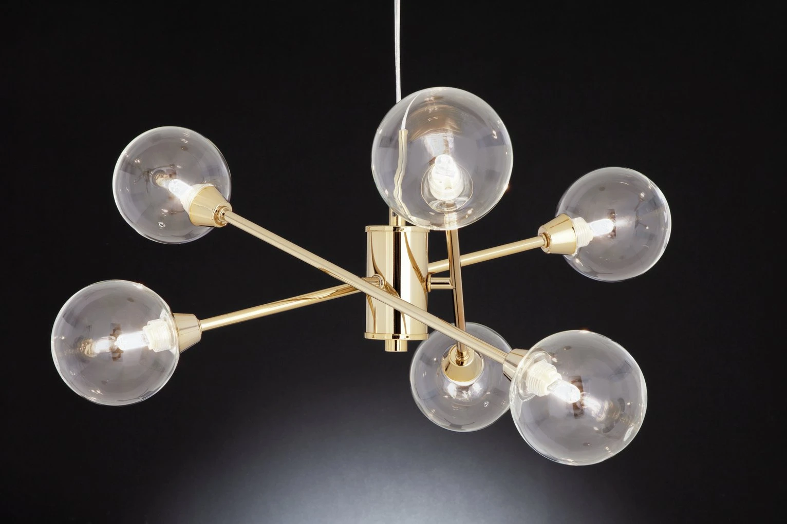 Launch your home into a dazzling new decor style with this eye-catching 6 light Sputnik ceiling pendant. Bursting with gold brilliance and gleaming glass orbs, it's a statement piece designed to take centre stage in any space. The 6 clear glass shades cast bright light all around, while the gold-coloured arms and ceiling rose reflect light and luxury.