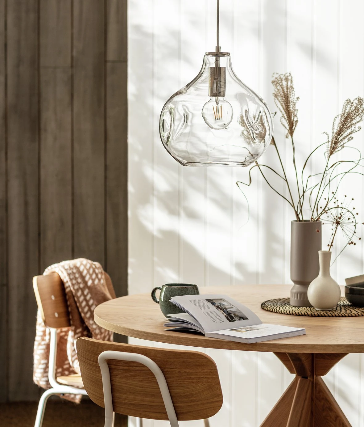 An elegantly simple design with a contemporary twist. The Ori dimple glass pendant light is a clean, modern addition to any dining room, kitchen, or hallway. Finished in nickel with a clear, mouth blown glass shade, it features a dimpled silhouette that adds a unique quality to the design. Suspended on a soft, fabric covered cord, it's ideal for adding ambience to a room without dominating the space. Looks fantastic in any style of home setting.