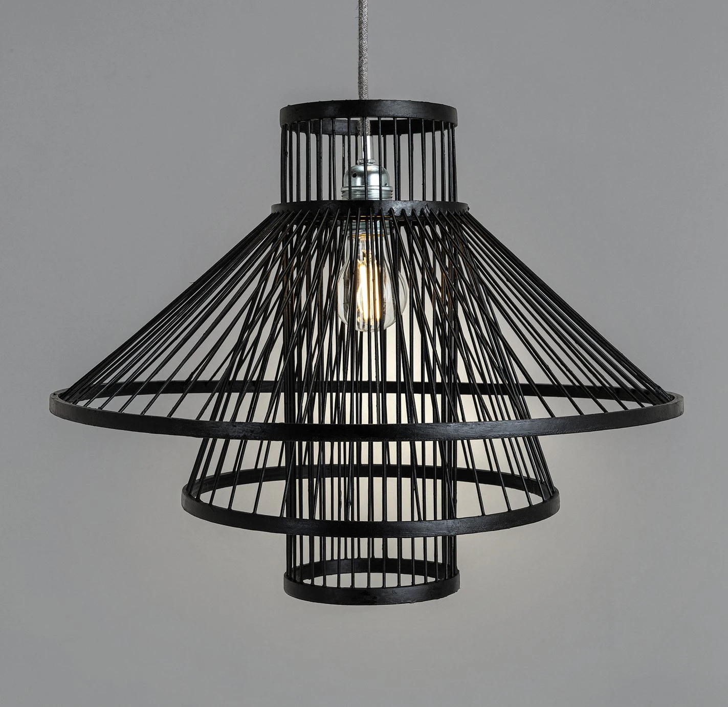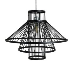 Three tiers for this stunning shade. With its contemporary cage design this black bamboo pendant shade demands centre stage. And there's never a dull moment. When the light shines through the 3 woven canopies you can enjoy your own shadow show. Very theatrical. A bold look for a lounge, bedroom, or dining room. Dramatically dark, naturally exotic.