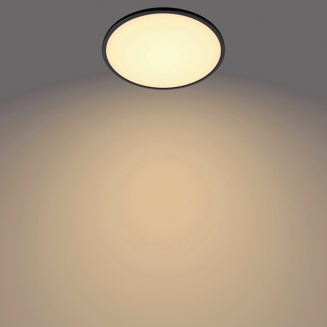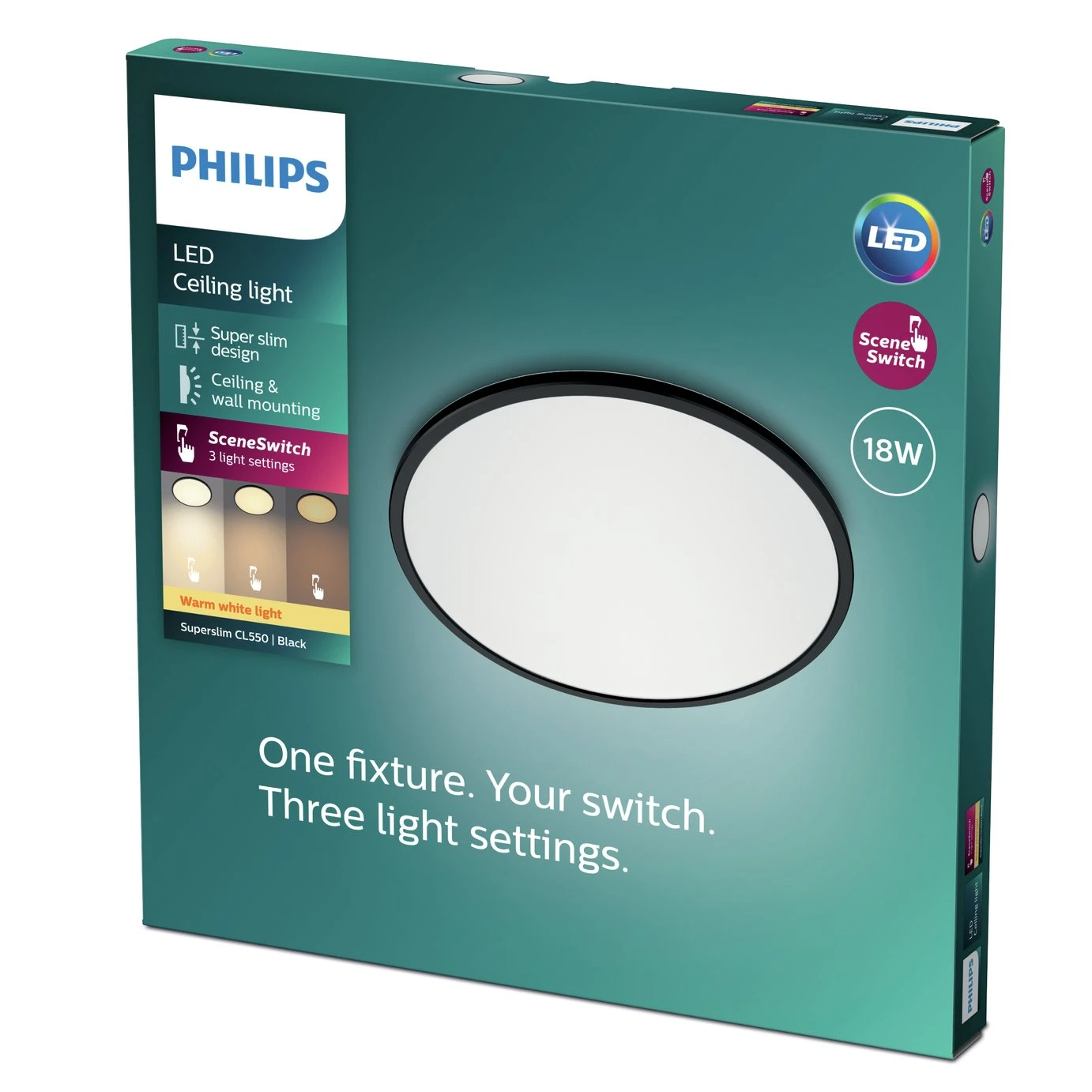 Superslim is a ceiling light from Philips, which emits a pleasant warm white light. The ultra-thin lamp uses Philips Sceneswitch technology. You can easily choose from three different lighting settings via your current wall switch, you do not need a dimmer. The ceiling light has an integrated memory clip that reminds you of the last selected lighting setting when the lighting is turned off for more than 6 seconds.